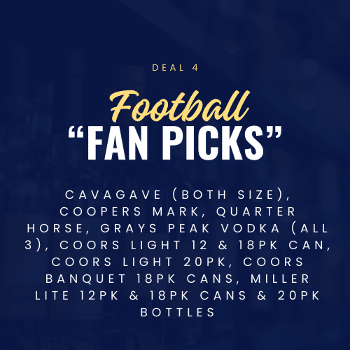 Cavagave (both size) ; Coopers Mark, Quarter Horse, Grays Peak Vodka (all 3), Coors Light 12 & 18pk can, Coors Light 20pk, Coors Banquet 18pk Cans, Miller Lite 12pk & 18pk cans & 20pk bottles